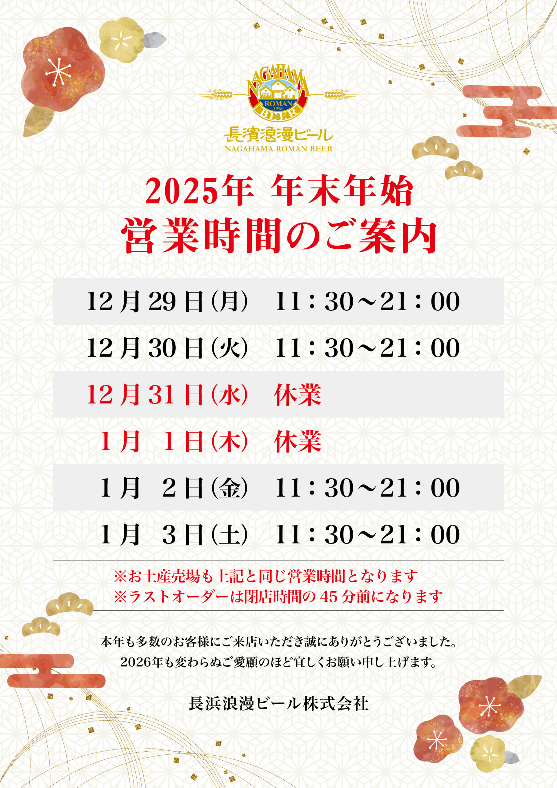 平素より格別のご愛顧を賜り、誠にありがとうございます。 年末年始の営業時間につきまして、下記の通りご案内申し上げます。