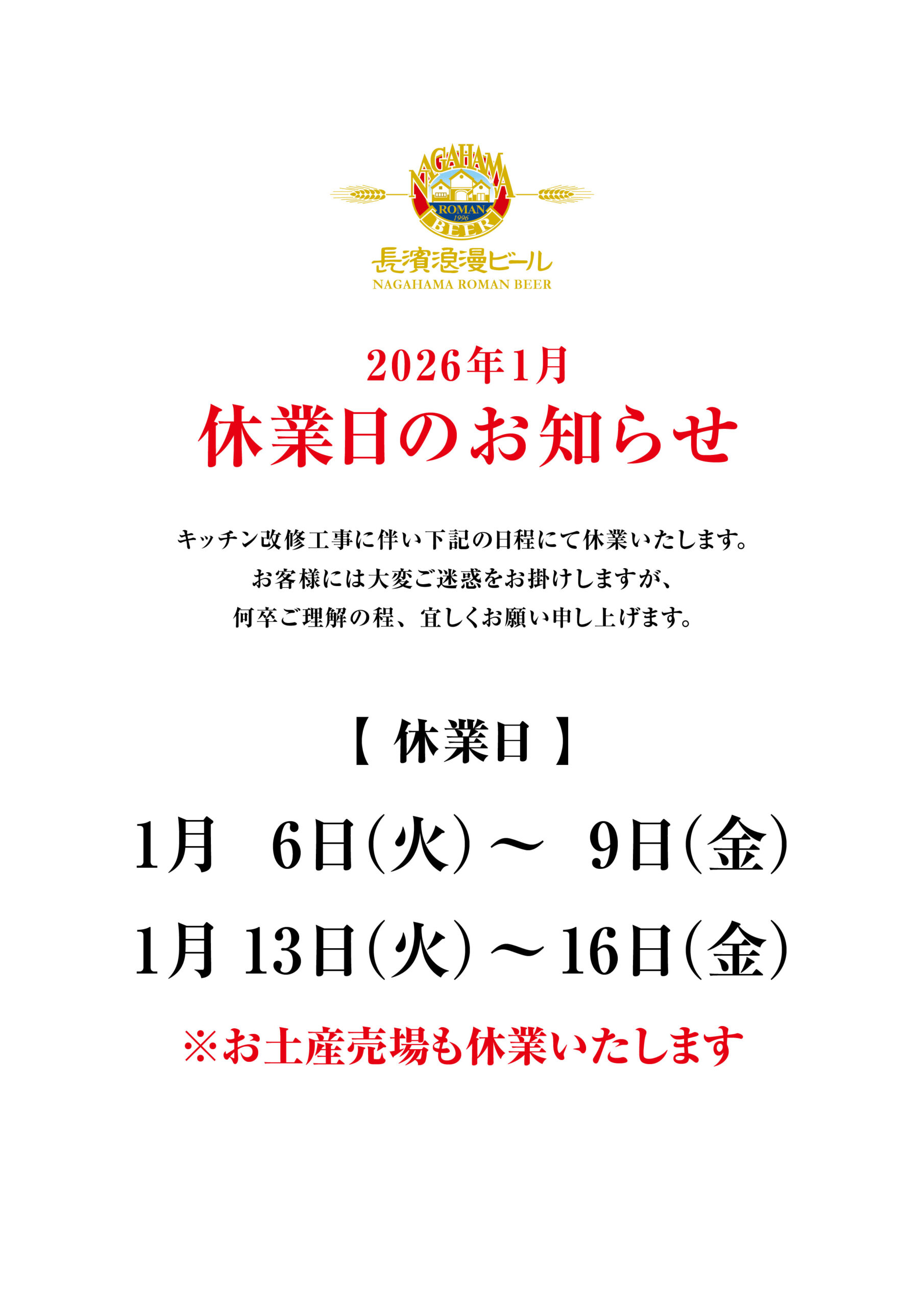 ※お土産売場も休業致します。