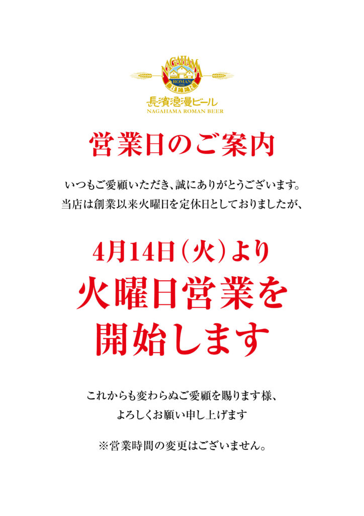 これまで定休日としてお休みしておりました火曜日ですが、 4月14日より営業を開始いたします。